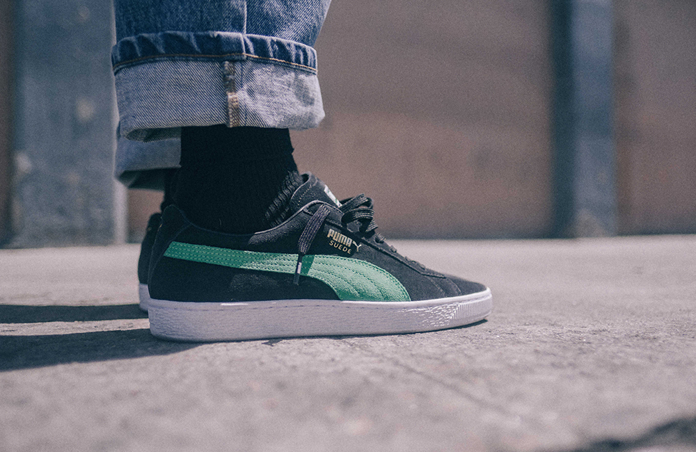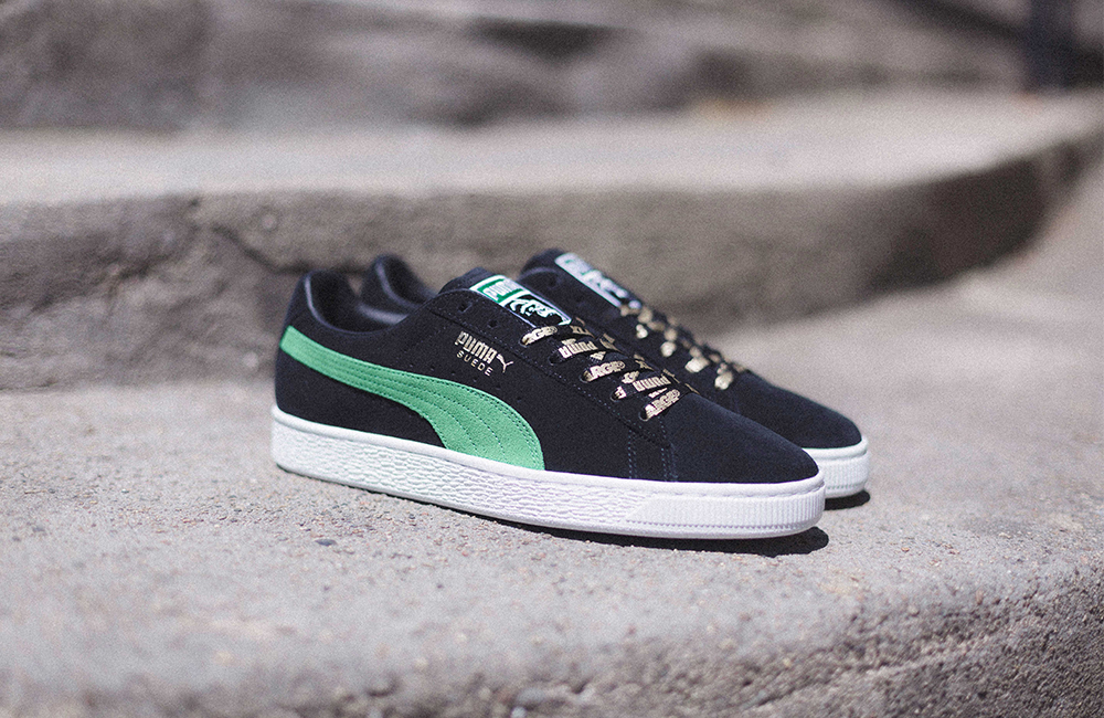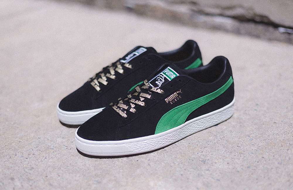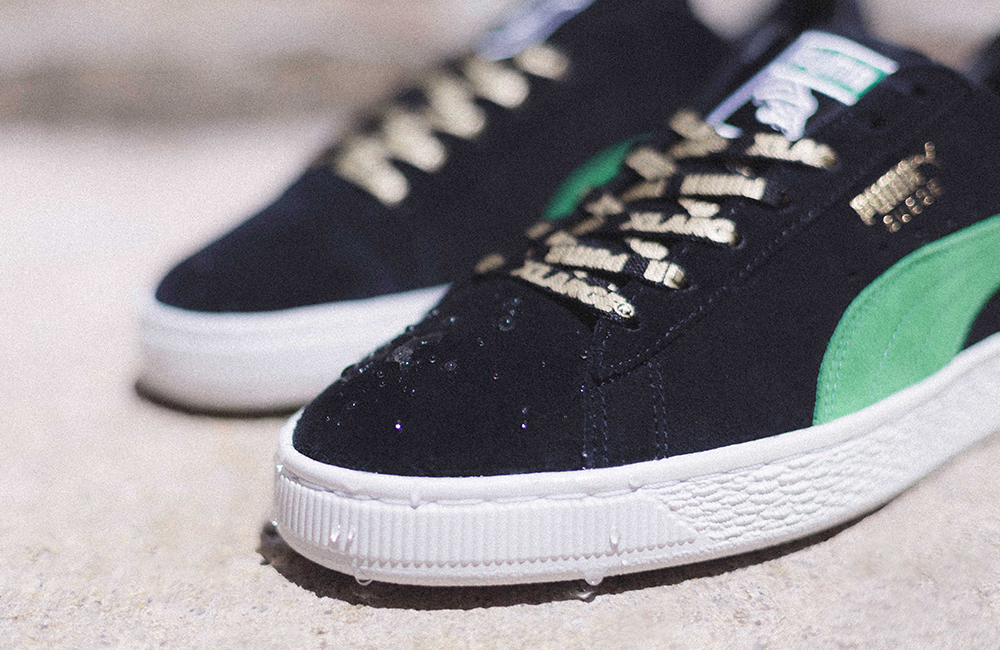 90年代当時にアメリカでリリースされていた「PUMA SUEDE」のヴィンテージモデルにインスパイアを受けた「ブラック×ケリーグリーン」のカラーウェイを採用。同じ配色を発表しないという哲学をもつ「PUMA SUEDE」にとって、待望の復刻カラーとなる。