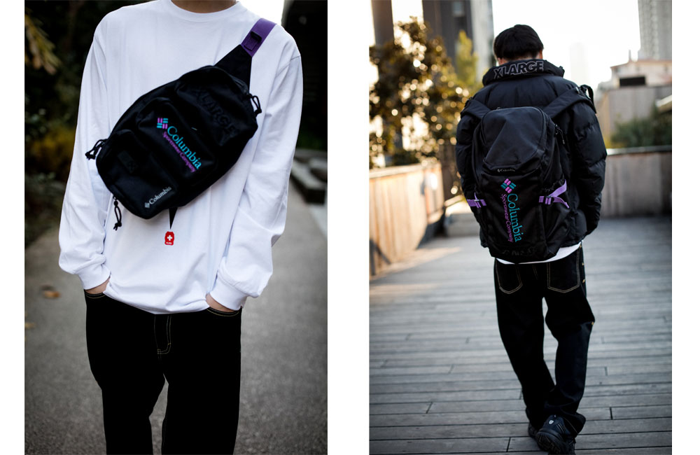 アクセサリーは2型を展開。 Columbiaの「VIPORRIDGE」をベースにしているヒップバッグとColumbiaの「PEA CREST 30L BACKPACK」をベースにしたバックパックは、両者ともに ブランドのロゴを刺繍で施しタウンユースを意識したデザインになっている。どちらもColumbiaの通常ラインで展開していないパープルをテープカラー採用したコラボならではの仕上がりになっている。